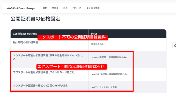 エクスポート可能な証明書は有料ですが、AWS内でのみ使用する場合はエクスポート不要なので無料で利用できます。