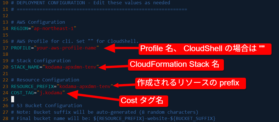 - STACK_NAME は CloudFormationが作成するスタック名です。わかりやすい名前や環境の命名規則に沿った形に変更します。