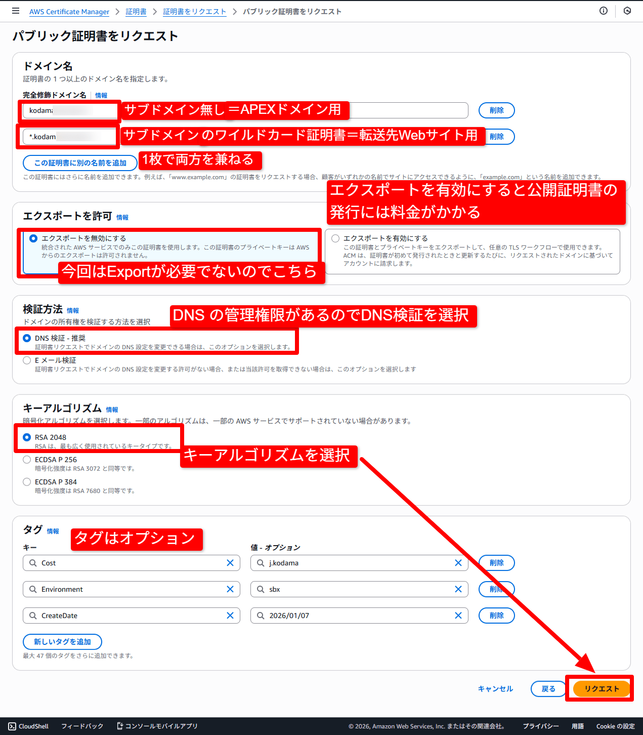 サブドメインのワイルドカードも一緒に設定します。これは転送先(www.example.comなど)でも使えますので、AWS Certification Manager から 1枚にまとめて発行します。