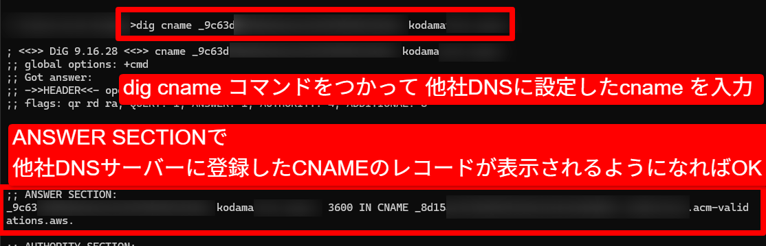 と打って、応答の ANSWER SECTION で、 CNAME名 の対となる CNAME値 が表示されれば OK です。