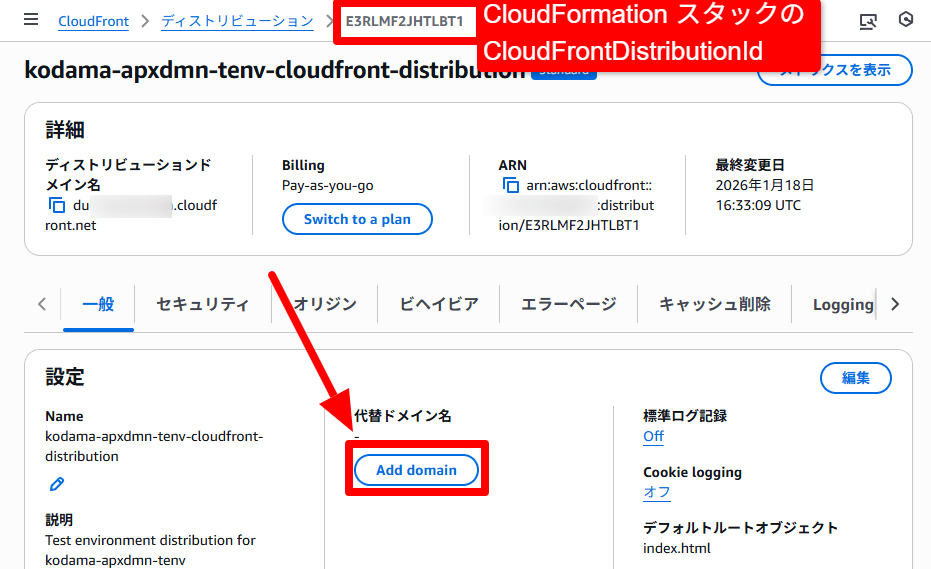 CloudFormationスタックに、先程作成した検証用リダイレクト先のスタックがありますので、 CloudFrontDistributionId の 値 にあるディストリビューションを覚えておいて、マネジメントコンソールの CloudFront の画面から開きます。
