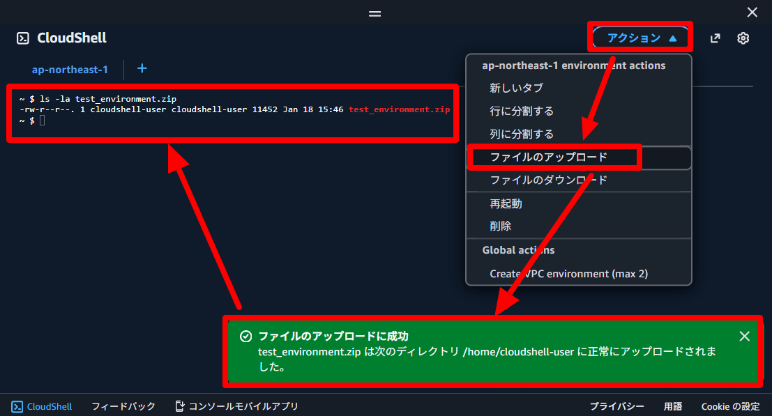 ダウンロードしたファイルを CloudShell などにファイルをアップロードし、