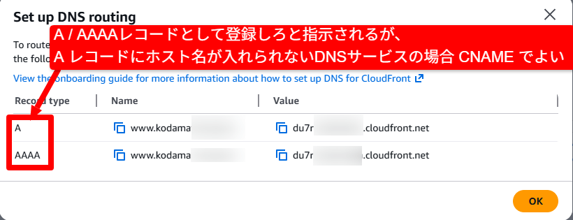 Route domains to CloudFront ボタンを押すと、DNSサーバーに設定する レコードの情報が表示されます。これを、利用しているDNSサーバーに設定します。