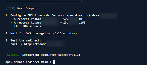 ~ $ unzip apex-domain-redirect-main-20260121.zip -d ./apex-domain-redirect-main Archive: apex-domain-redirect-main-20260121.zip inflating: ./apex-domain-redirect-main/apex-domain-redirect-main.yaml inflating: ./apex-domain-redirect-main/deploy.sh inflating: ./apex-domain-redirect-main/README-jp.md inflating: ./apex-domain-redirect-main/PARAMETERS-jp.md ~ $ cd apex-domain-redirect-main apex-domain-redirect-main $