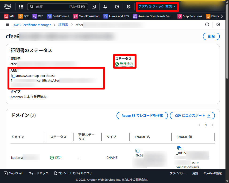 AWS Certificate Manager(ACM) にある証明書は同じリージョン内でないと使用出来ないため、今度は東京リージョンで発行する必要があります。