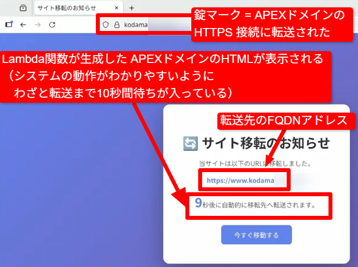 APEXドメイン転送の動作や、転送しようとしているFQDNがわかりやすいように、わざと転送まで10秒待ちをいれていますが、実際のWebサイトでは即時転送に変更してください。