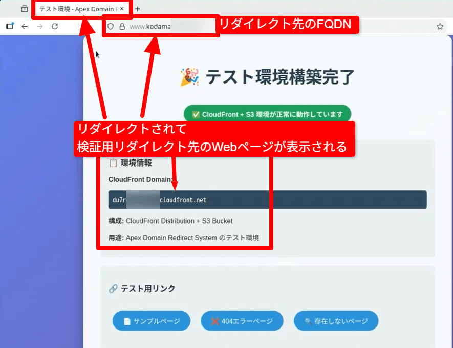 10秒後に前編で構築した検証用リダイレクト先のWebページに無事転送されました!
