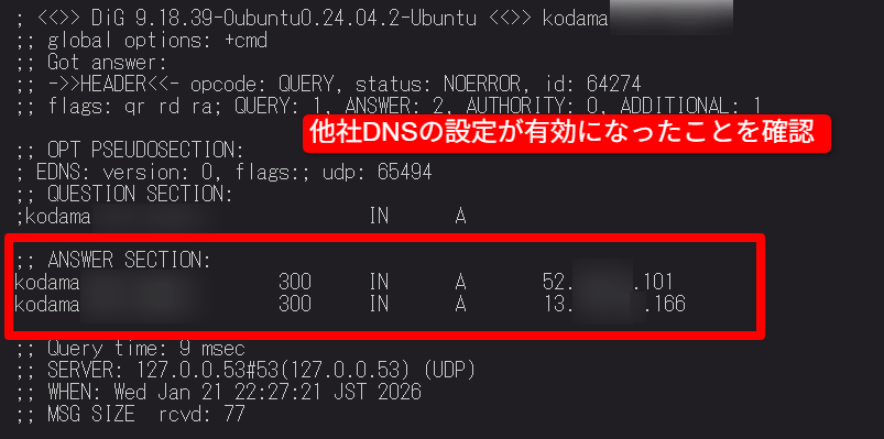 dig コマンドなどで、APEXドメインに対してDNSクエリを行い、デプロイ結果で表示されたAPEXドメインのAレコード2つが表示されれば OK です。