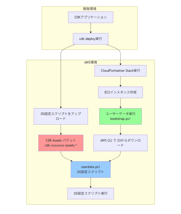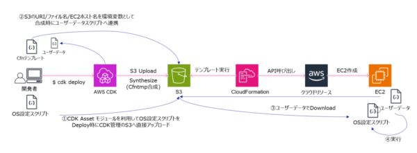 OS設定スクリプトをcdk bootstrap実行時に作成されるS3 assetに配置することでユーザーデータのサイズ制限を回避して、OS設定スクリプトをEC2にダウンロードさせています。