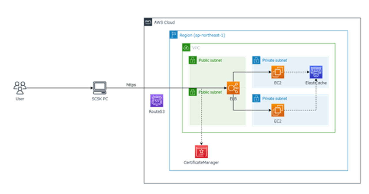 ユーザーはSCSK PCからRoute53を介してELBにアクセスし、プライベートサブネット内のEC2に接続します。