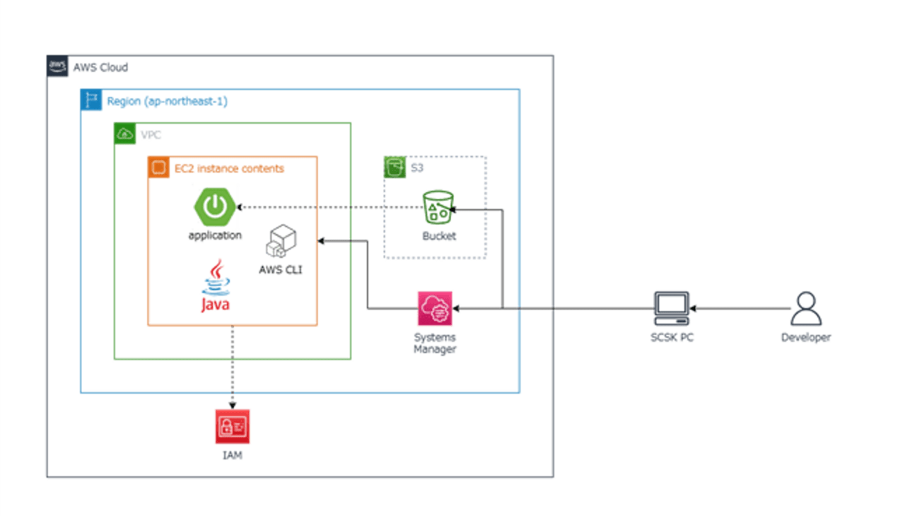 S3からアプリケーションを取得し、Systems Managerで運用管理、IAMで権限を制御します。