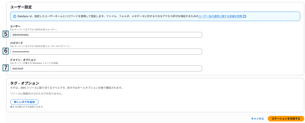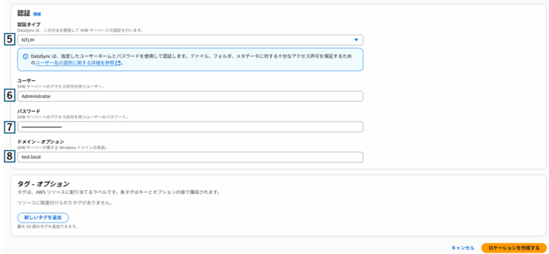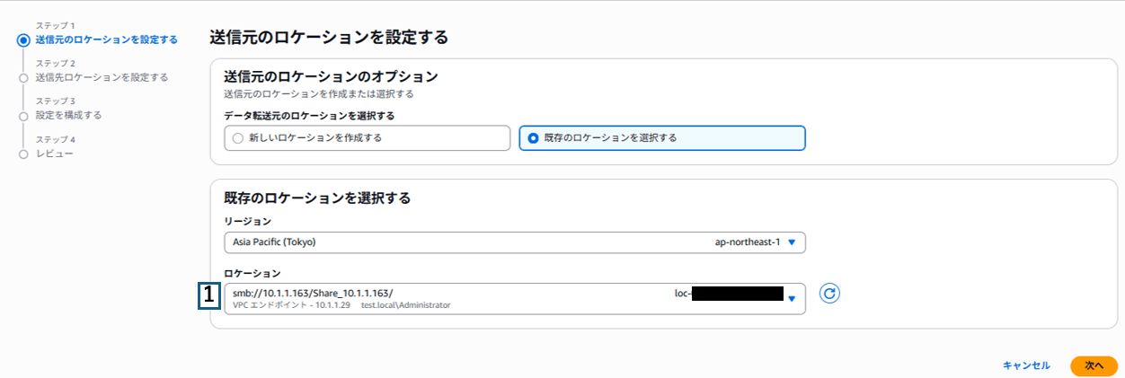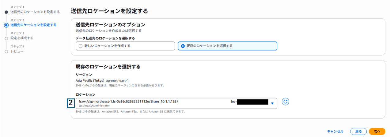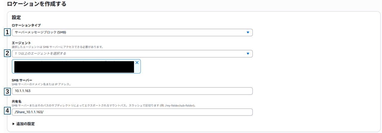 1 | ロケーションタイプ | 送信元のロケーションタイプを選択 今回はEC2の共有フォルダが送信元となるため、サーバーメッセージブロック(SMB)を選択 |