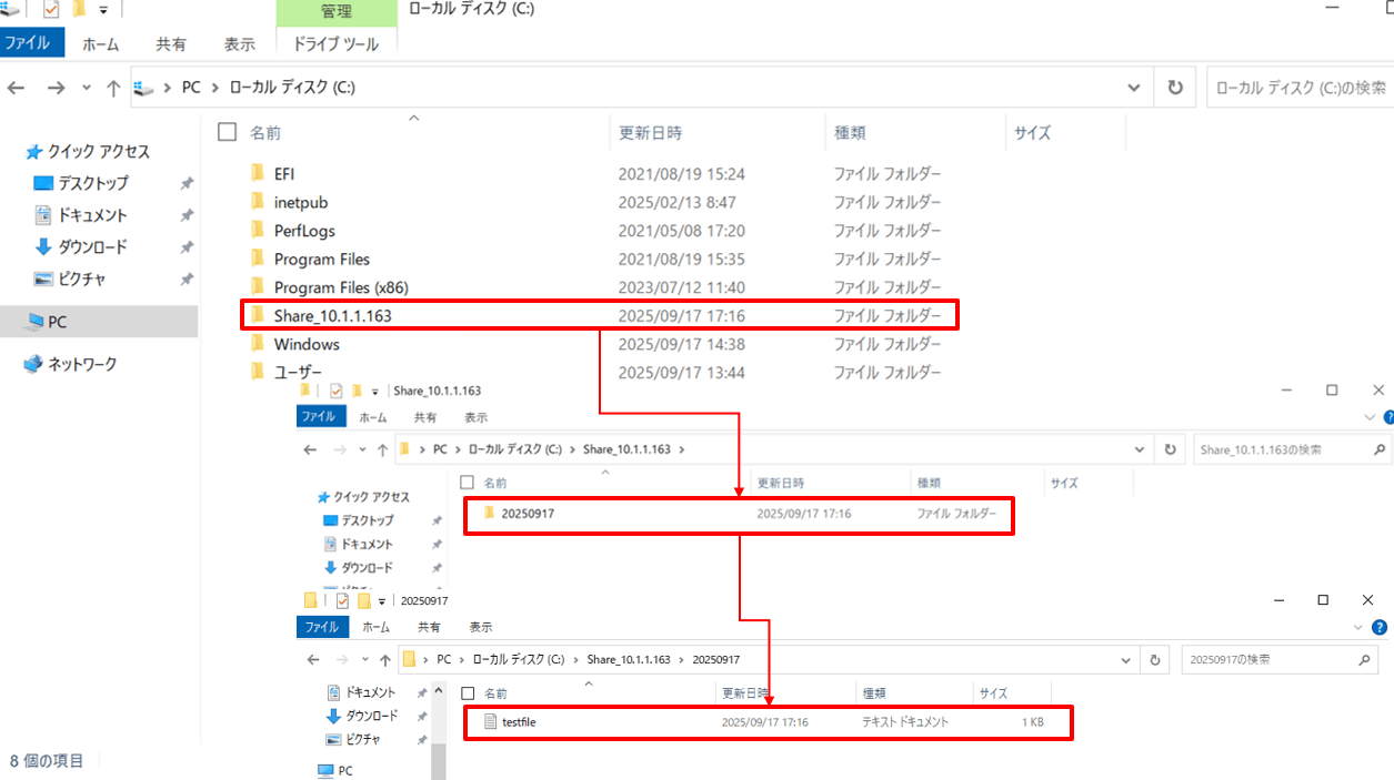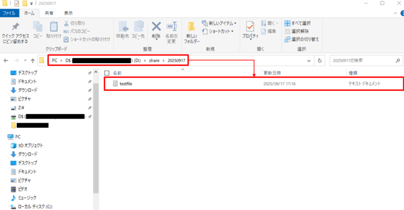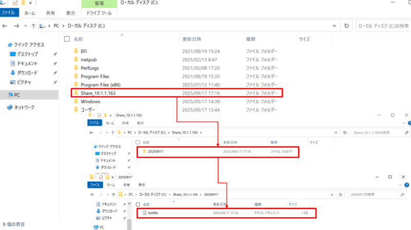 FSxのshare配下を確認すると、送信元インスタンスで作成したフォルダとファイルが転送されていることを確認できました。