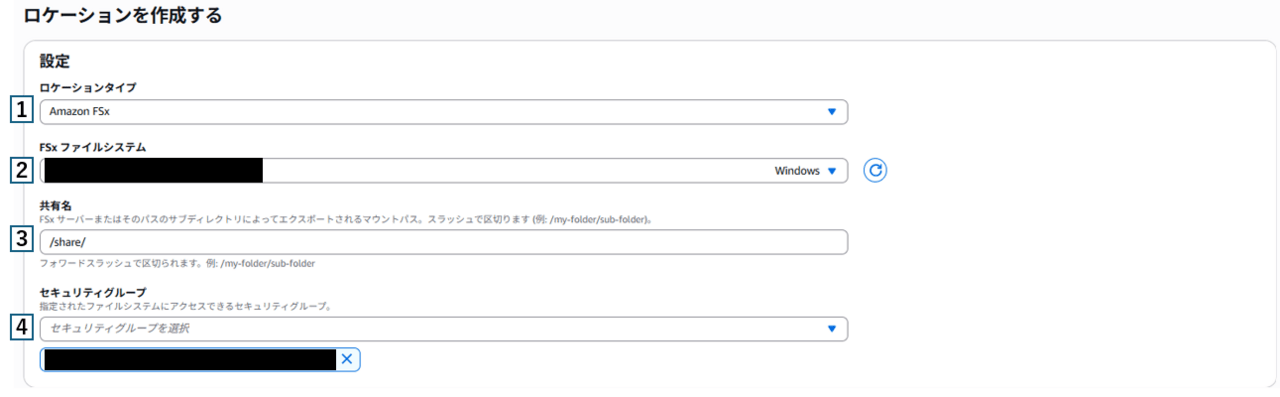 1 | ロケーションタイプ | 送信元のロケーションタイプを選択 今回はFSxが送信先となるため、FSxを指定 |