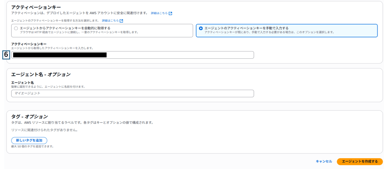 6 | アクティベーションキー | エージェントのアクティベーションキーを手動で入力するを選択 「DataSyncのアクティベーションキーの取得」で取得したアクティベーションキーを入力 |