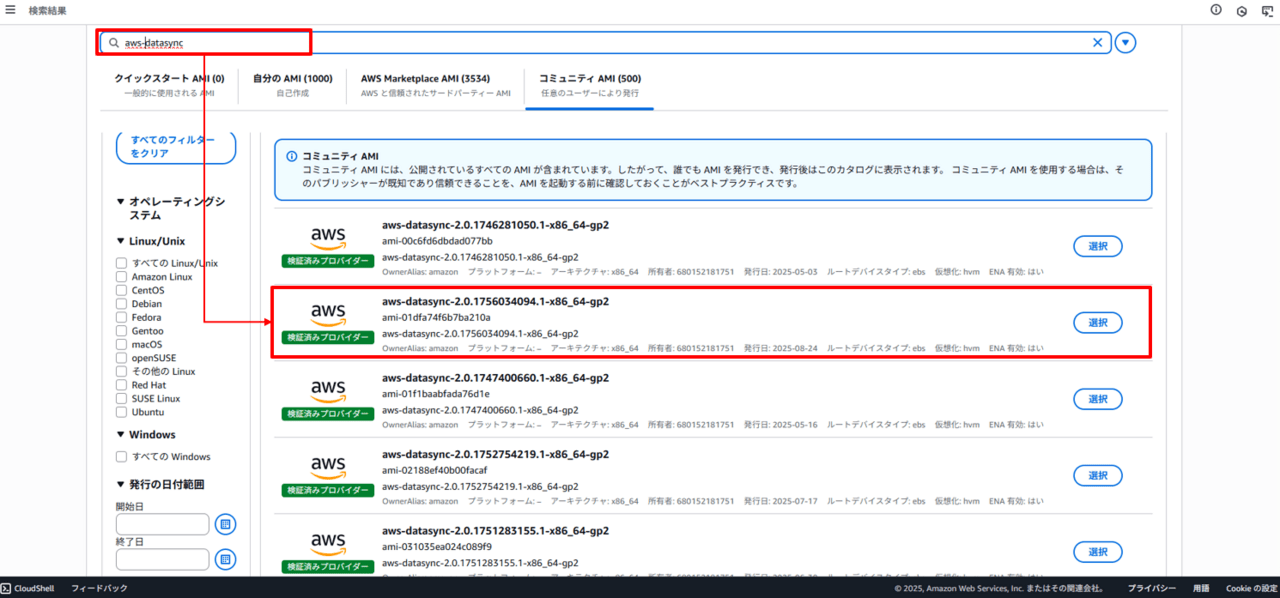 EC2作成のAMI選択画面から、「aws-datasync」と入力すると、DataSyncAgent用のAMIが表示されるため、最新版のAMIを選択します。