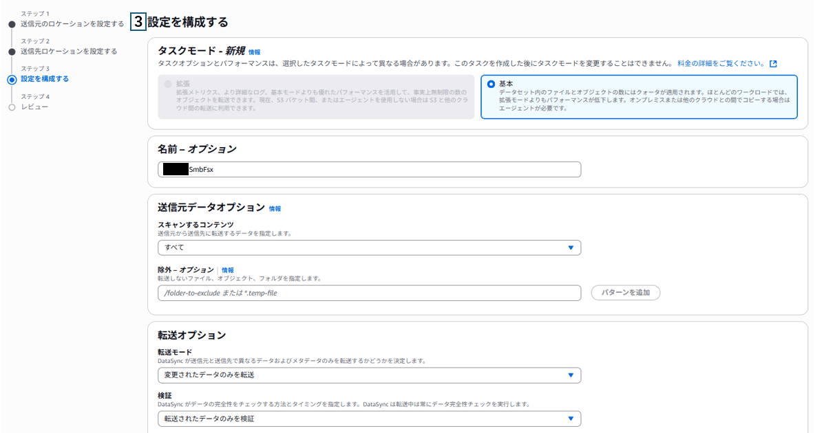 DataSync -> タスク -> タスクを作成 からタスクを作成します。