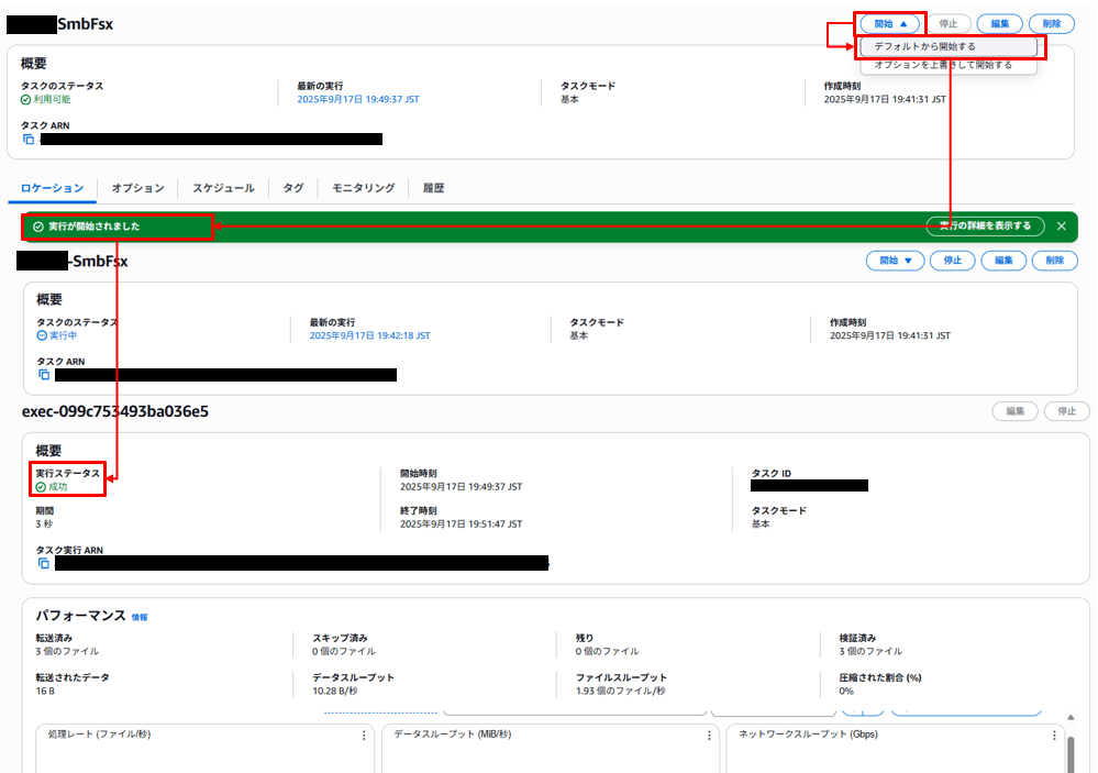 ファイル転送が成功すると、実行ステータスが「成功」と表示されます。