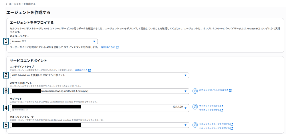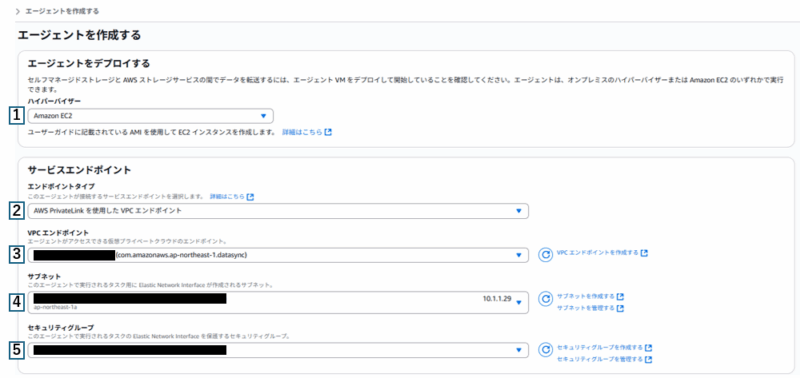 3 | VPCエンドポイント | 「DataSync用のエンドポイント作成」で作成したエンドポイントを選択 |