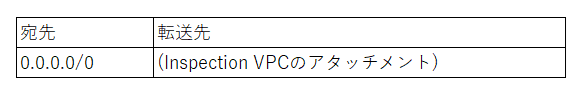 インターネットからの戻りに適用されるルートテーブルです。Network Firewallの検査対象にしたいので、すべて(0.0.0.0/0)をInspection VPCに向けます。