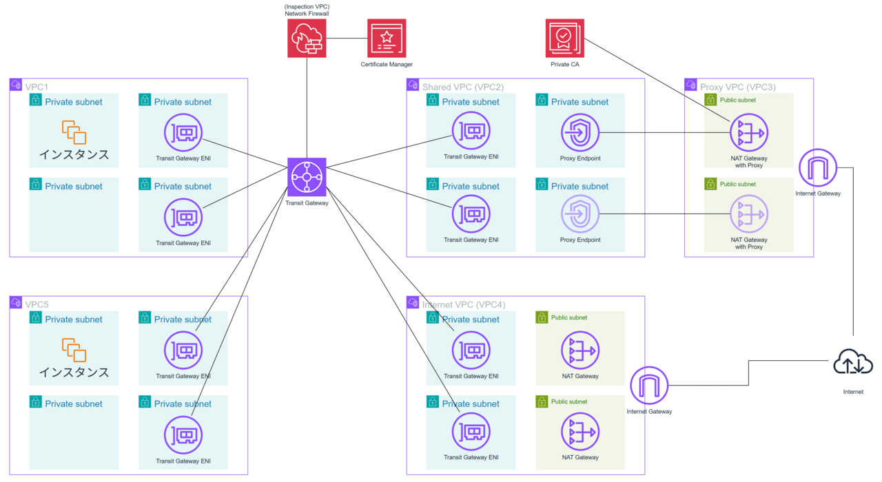本アーキテクチャでは、Network Firewall ProxyエンドポイントとひもづくNetwork FirewallをProxy VPCという名前のTransit Gatewayに接続していない独立したVPCに配置しています。このVPCにNAT GatewayとInternet Gatewayを配置しインターネットに接続できるようになっています。