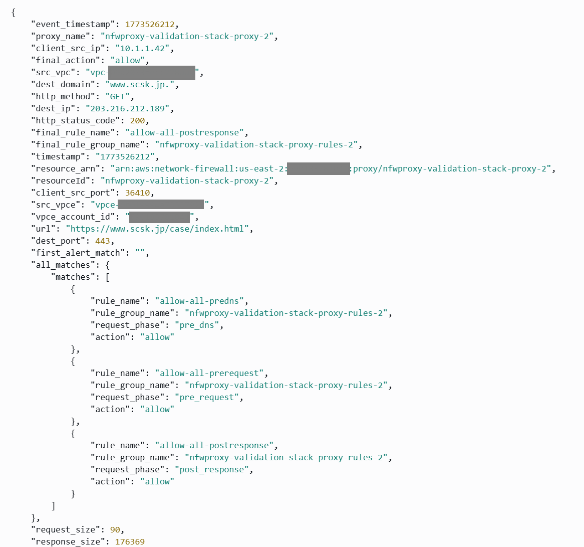 • 送信元VPCエンドポイント(src_vpce)があるので、どこのProxy VPCエンドポイントが使われたか分かるようになっています。