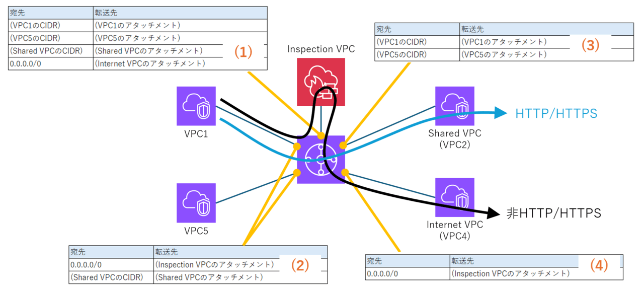 通常、Inspection VPCを持つTransit Gatewayでは大きく2つのルートテーブルを運用します。