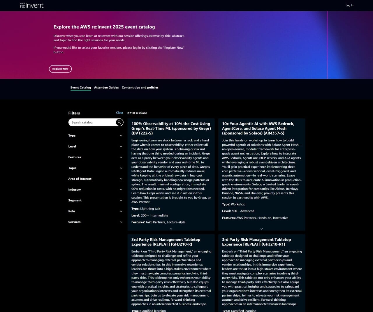 re:Invent の公式サイトには、実施されるセッションの概要を見ることができる Event Catalog があります。