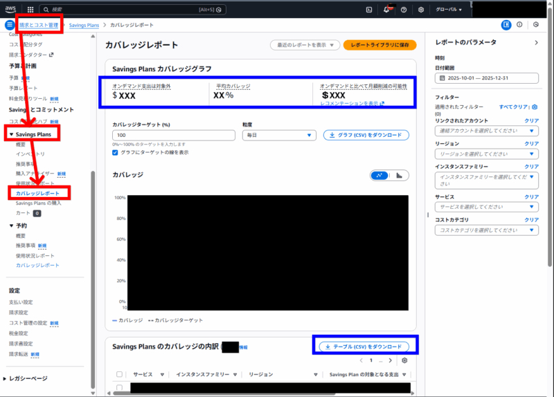 | カバレッジ | [ Savings Plan の対象となる支出 ] ÷( [ Savings Plan の対象となる支出 ] + [ オンデマンド支出 ]) | 平均するとカバレッジレポートの [ 平均カバレッジ ] になる |