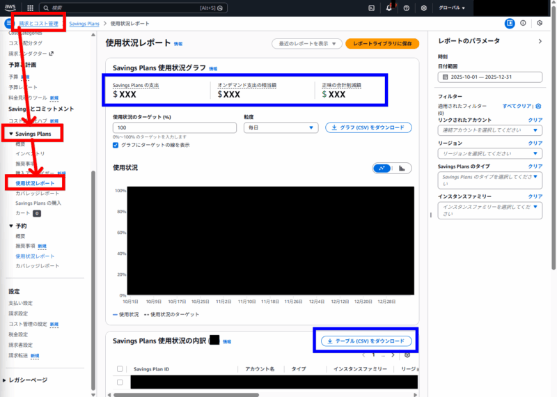 Billing and Cost Management > Savings Plans > 使用状況レポート