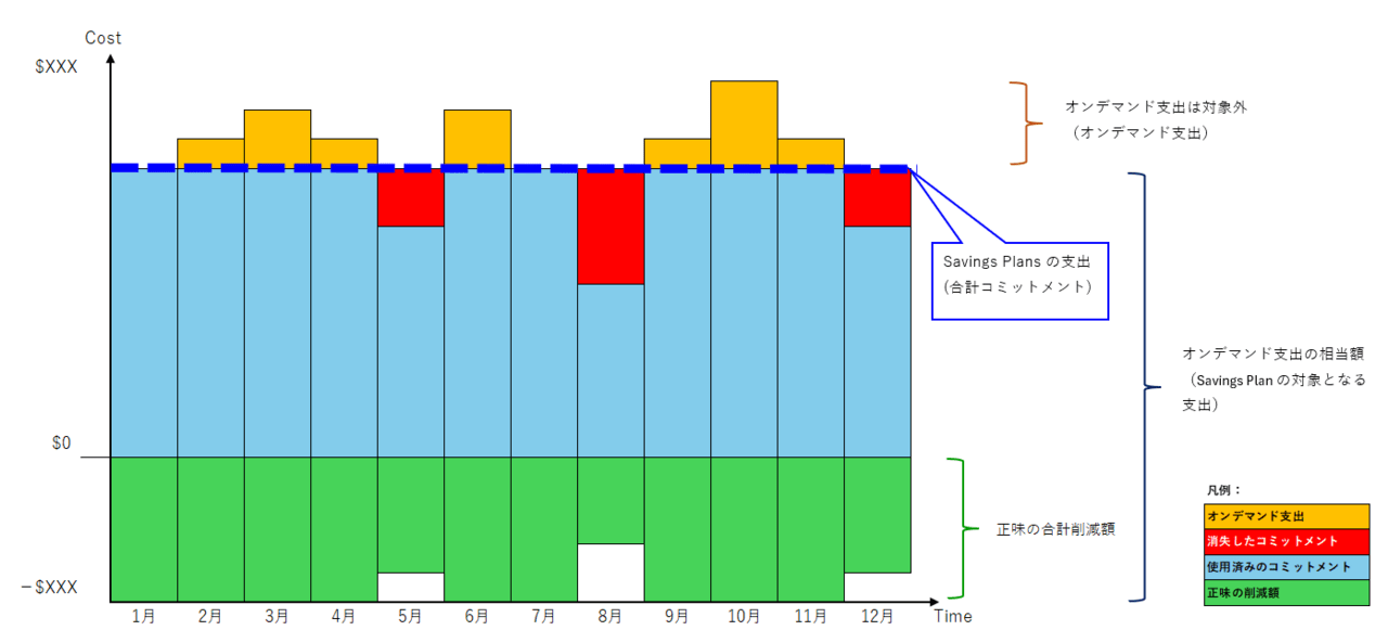 | 正味の削減額 | [ Savings Plan の対象となる支出 ] - [ 合計コミットメント ] | 合計すると使用状況レポートの [ 正味の合計削減額 ] になる | |