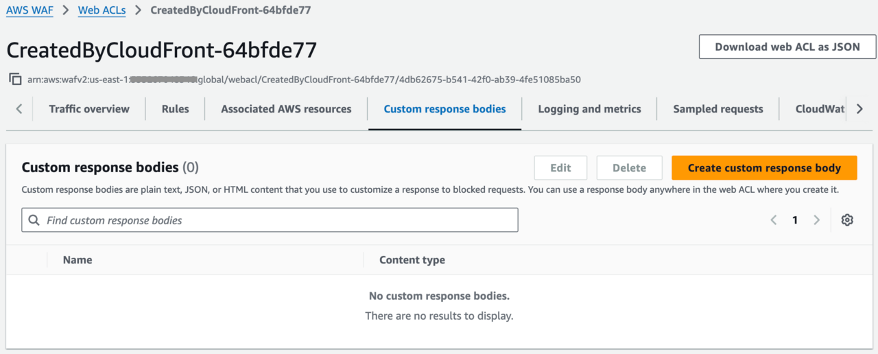 該当するWAFの設定項目から「Custom response bodies」のタブを選択し、「Create custom response body」をクリックします。