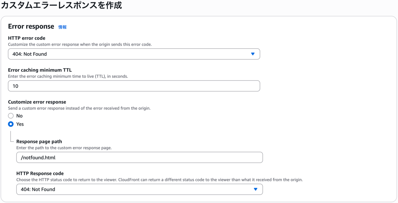 ここでは、CloudFrontのカスタムエラーレスポンスを設定し、404エラーに対して「notfound.html」を表示させるようにします。