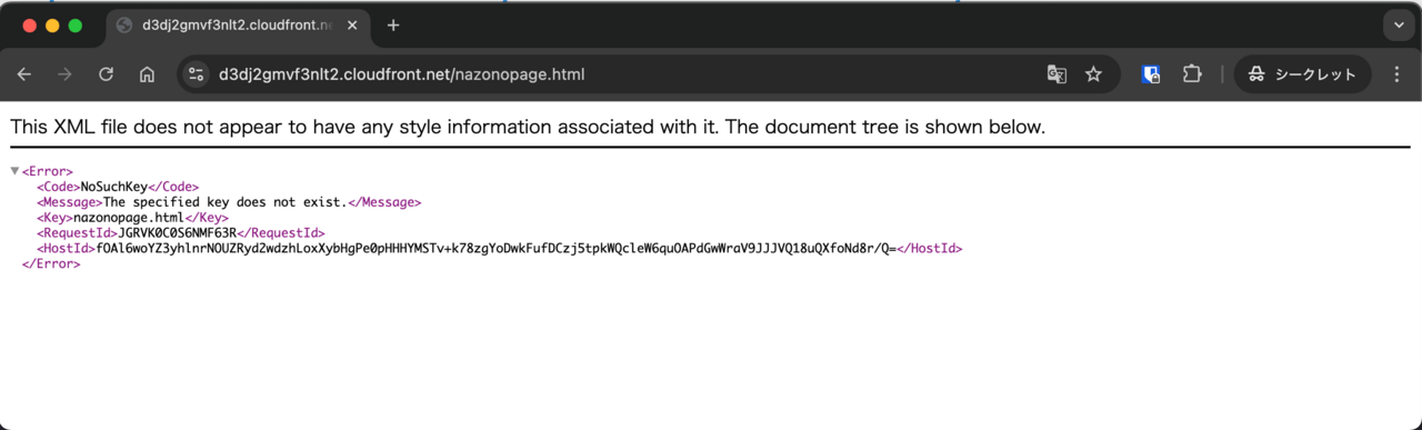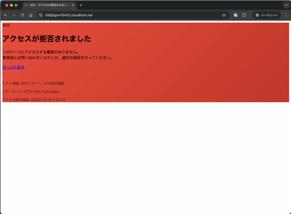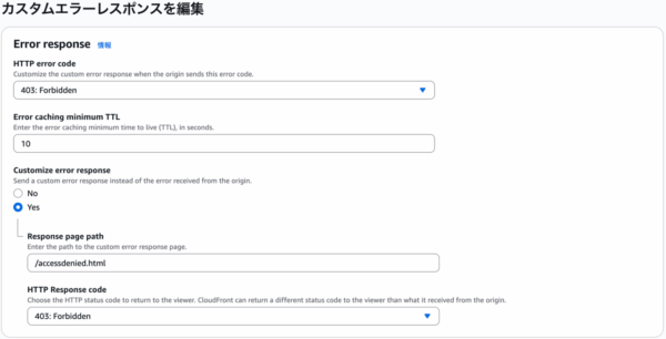 先程設定したのはCloudFrontのカスタムエラーレスポンスで、403 ForbiddenのときにはS3の中に格納されている「accessdenied.html」を表示させるようにすること…