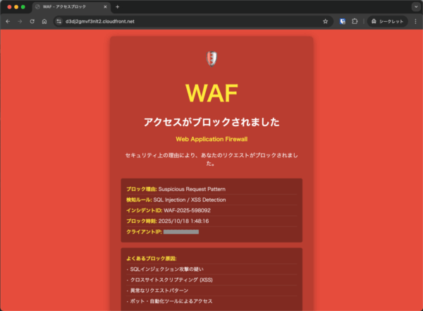 WAFによってしっかりブロックされていることを確認できました。