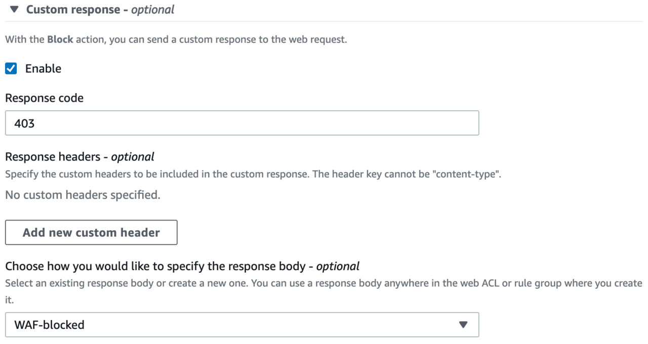 1. AWS WAF custom response – If the AWS WAF Block action has a custom response enabled, the protected resource sends the configured custom response back to the client. Any response settings that you might have defined in the protected resource itself have no effect.