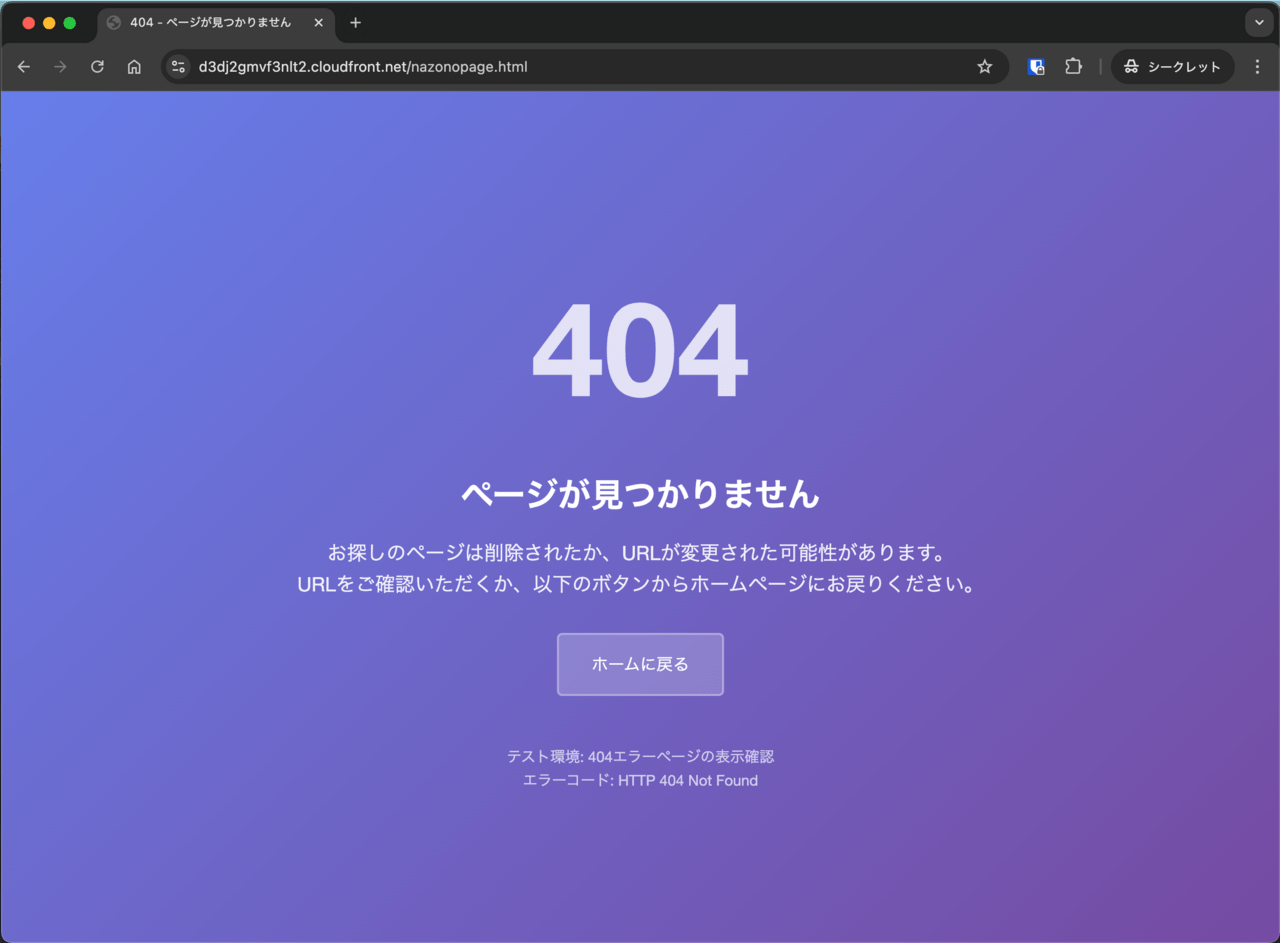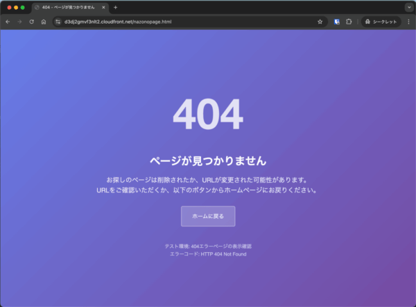 設定が完了したら、実際に存在しないページにアクセスして確認をします。