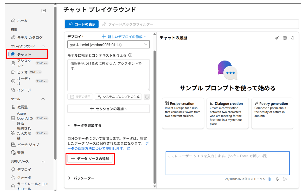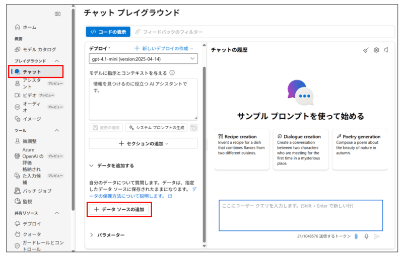Foundryポータルを開き、デプロイしたチャットモデル画面に移動します。データソースの追加ボタンから