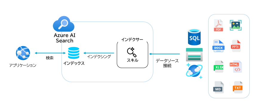 Blob Storage、SQL、Cosmos DB など、様々なストレージ/DB、様々なファイル形式を検索対象として扱えるのがポイントです。
