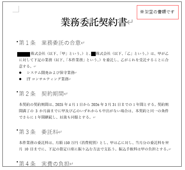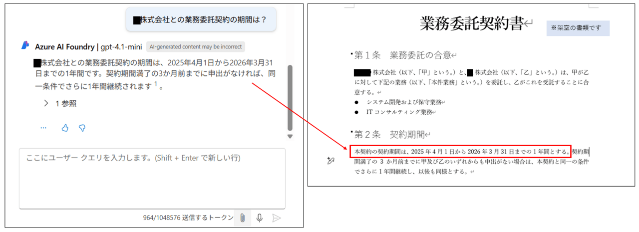 今回検索対象とする社内文書として架空の契約書を準備しました。このドキュメントをデータソースとして登録し、AI Searchにインデックスとして登録する流れです。この架空の書類の情報は当然LLMは知らないので、動作確認でこの書類の情報を参照して回答してくれたら成功というわけです。