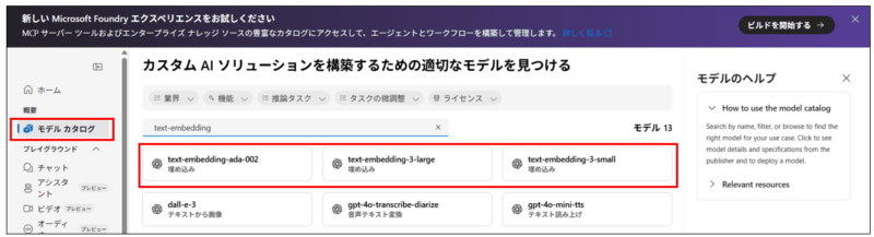 モデルカタログタブからembeddingモデルを選択しデプロイする。
