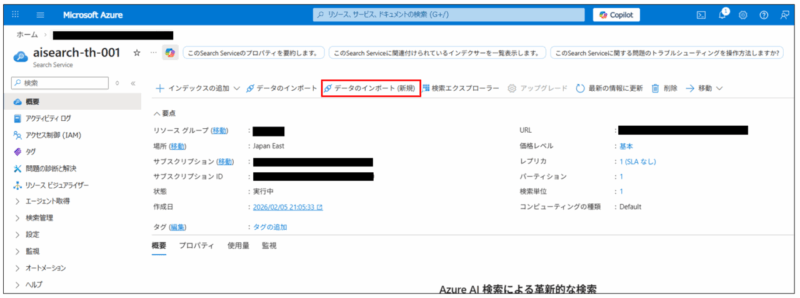次にインデックスを作成します。Azure AI Searchのリソースを作成したあと、概要タブから「データのインポート(新規)」を押します。