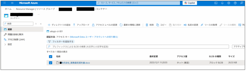 ストレージアカウントを作成した後、コンテナを作成し、下図のように対象ファイルをコンテナにアップロードします。