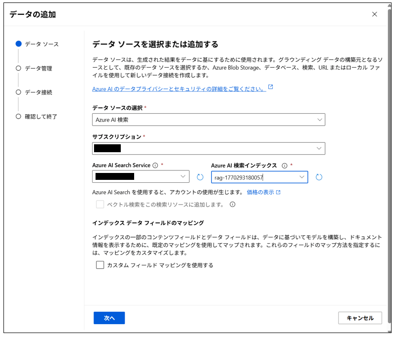 対象AI Searchのインデックスを選択すると、データソースとして紐づけができます。