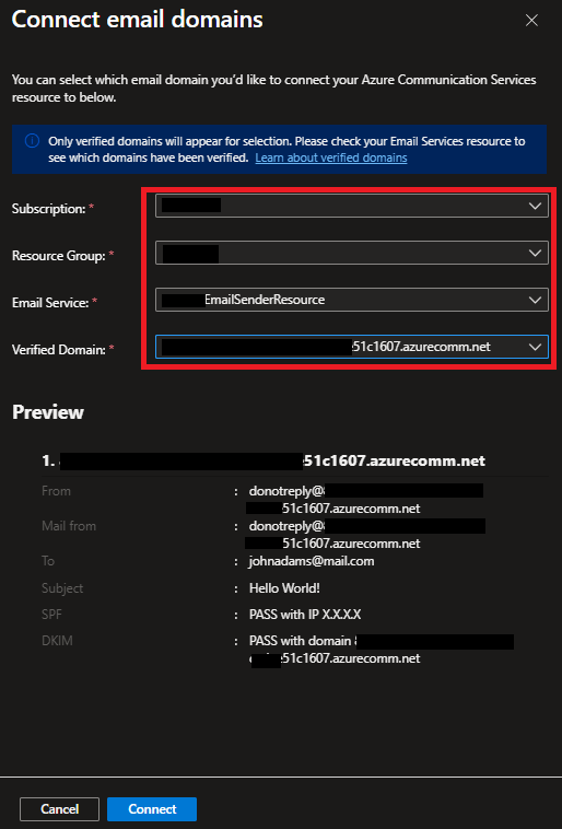 - 作成したEmail Communication Servicesとドメインを指定して、「Connect」を押下。
