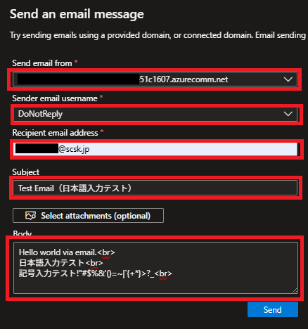 - 送信メールの情報を入力して、「Send」を押下。