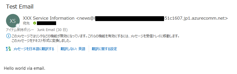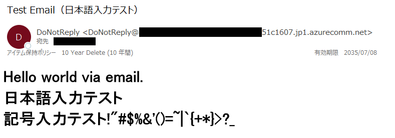 実際に届くメールアドレスは、「.jp1.azurecomm.net」で届きました。