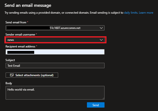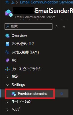 送信元メールアドレスは、Email Communication Servicesの方で、「Provision domains」に登録したドメインの中に設定されています。