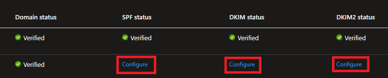 そのまま、SPFとDKIM、DKIM2も有効化するために「Configure」を押下して、指定されたDNSレコードを登録する。