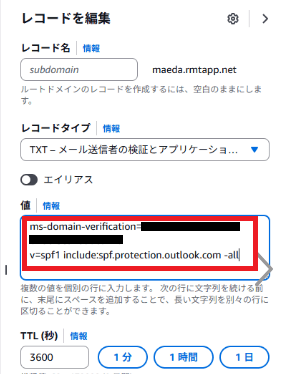 ※SPFはドメイン認証のためのTXTレコードと重複するので値に2行目として追加する。